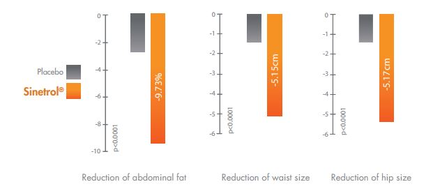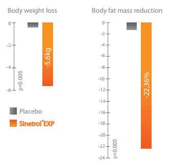 Estudio doble ciego, controlado que reunía a 2 grupos de 10 personas. A un grupo se le administraba Sinetrol y al otro un placebo. Entre las personas se encontraban con sobrepeso e índice de obesidad (27-33). La suplementación se realizó durante 12 semanas con una dosis de 1,4g al día de Sinetrol o placebo, 1 cápsula en desayuno y otra en almuerzo. Sin variación de los hábitos alimenticios ni actividad física.
